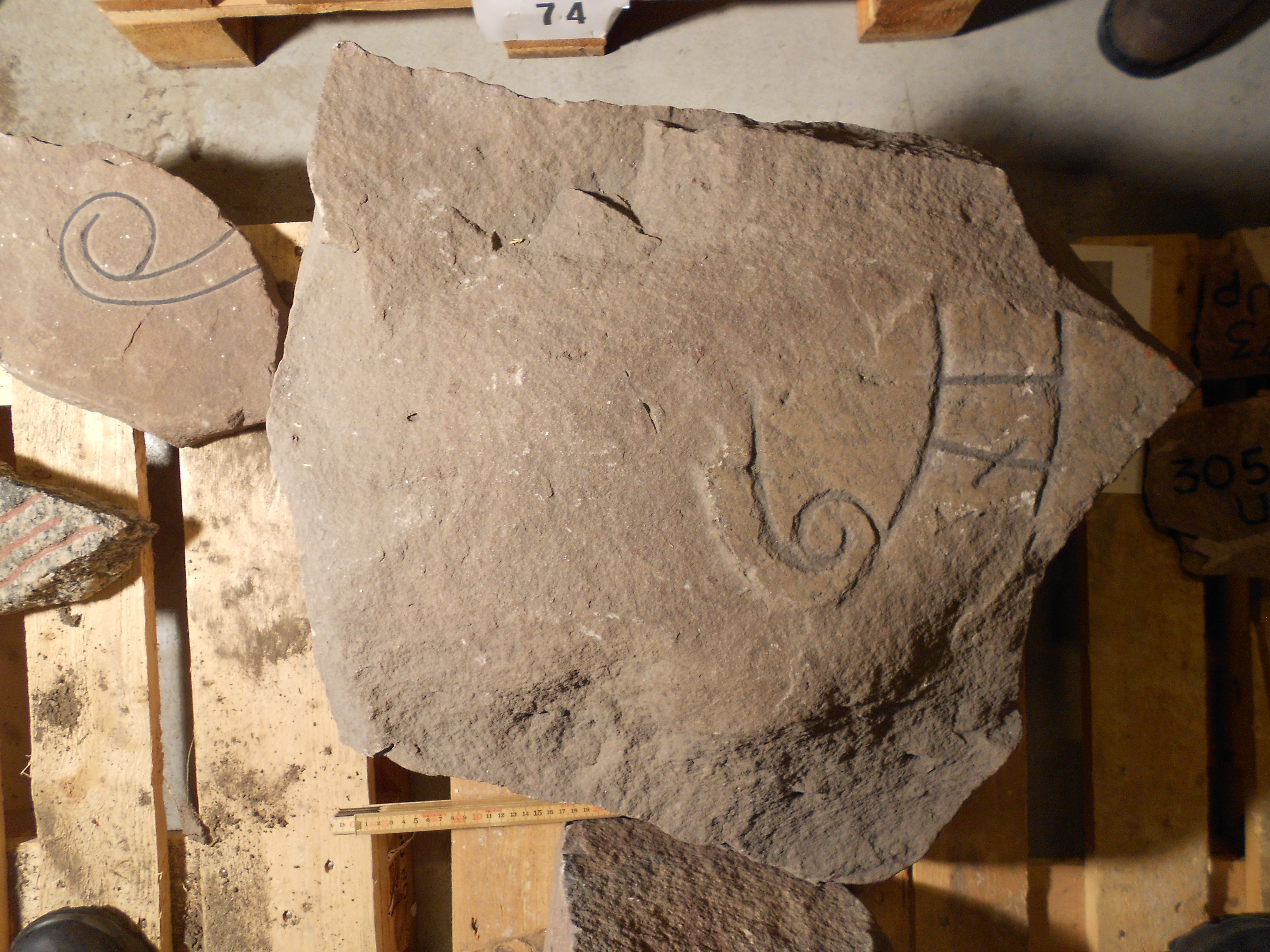 På den högra sidan finns ett stort halvcirkelformat avflagrat parti, som sträcker sig över tre fragment (det syns i sin helhet på bilden på Birkaprojektets blogg). Jag tror att det är ett tecken på att man har eldat intill stenen och formen på skadan tyder på att den då måste ha legat på marken. Vad jag minns hade vi inte några spår av kilning, så detta kan ha skett relativt tidigt, kanske redan under medeltiden. Vilket syftet sedan har varit är svårare av avgöra.