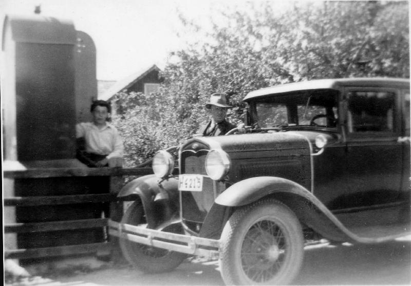 Tankning av bensin. Rune Karlsson fyller på bensin i Martin Svenssons A-ford. Foto: okänd, licens: cc-by