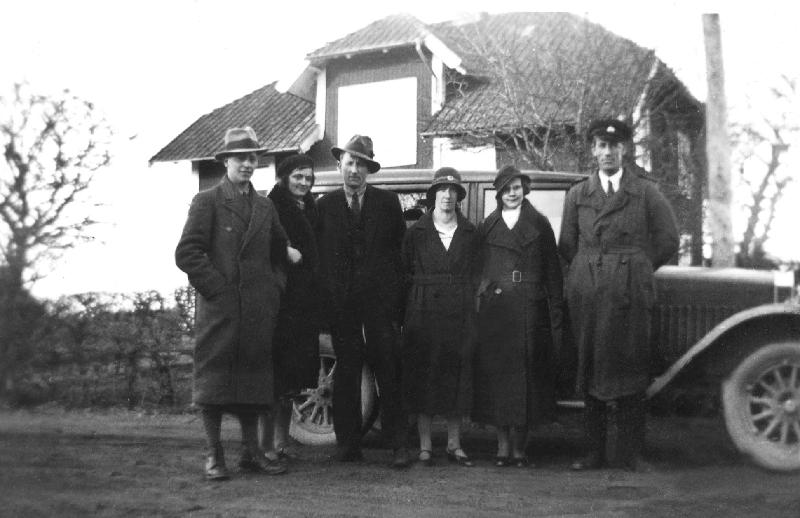 Taxichaufför Silfverduk (längst till höger i bild) vid Antonsgården omkring 1930. Foto: okänd, licens: cc-by