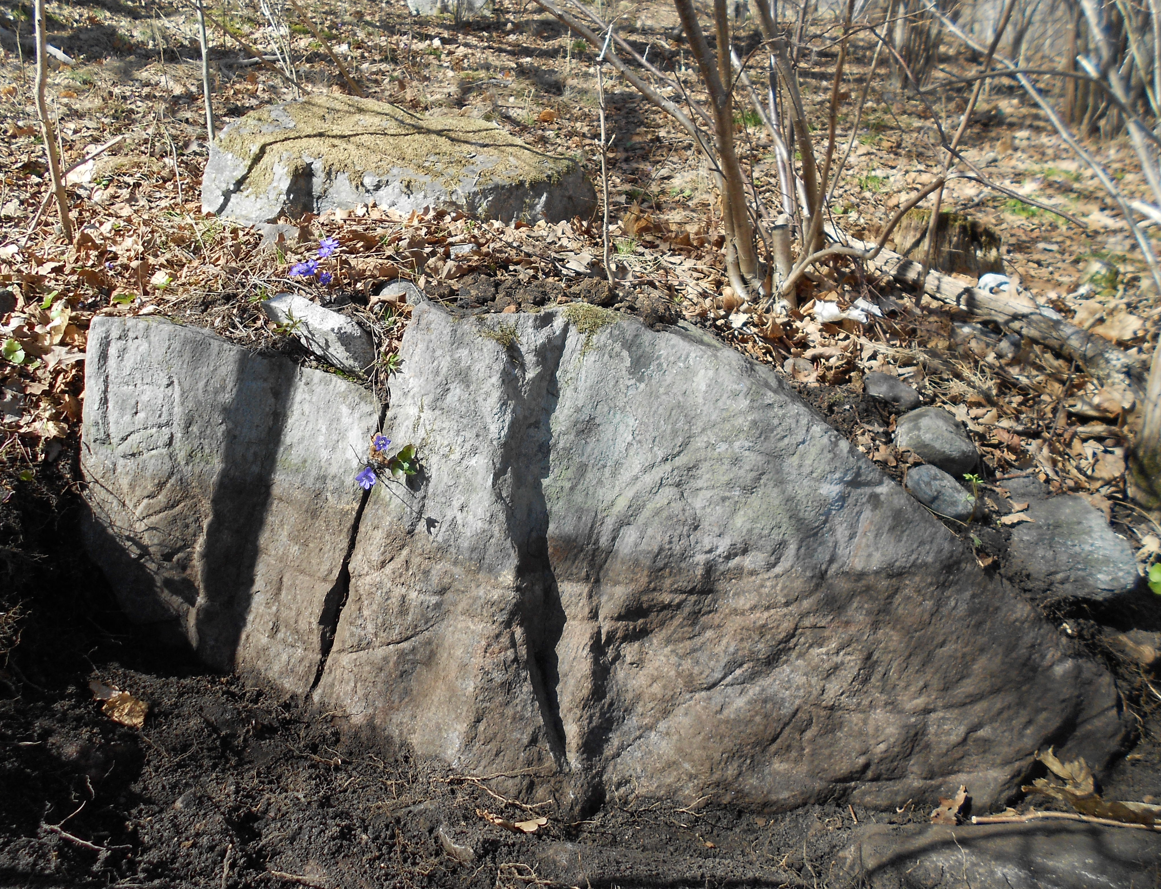 Bilden visar en del av en runsten som stucker upp ur marken där det växer blåsippor