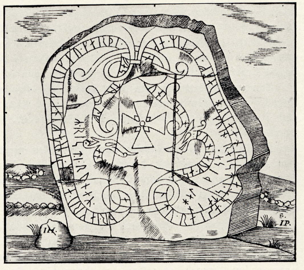 Bogesundsstenen på 1600-talet enligt det träsnitt som skars efter Peringskiölds teckning (Bautil nr 223). Efter Upplands runinskrifter