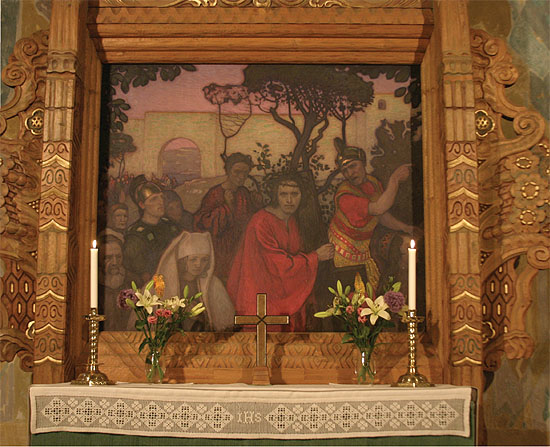 Altartavlan i Trefaldighetskyrkan i Arvika. Altartavlan är målad av Björn Ahlgrensson som tillhörde Rackstadkolonin. Arvikaborna kunde känna igen flera ansikten på motivet eftersom det var flera lokala profiler som stod modell. Fotograf: Torgny Lindén, licens: cc-by