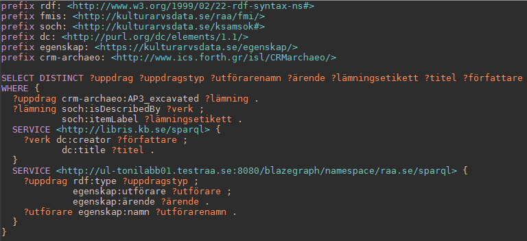 Men vi var ju inte begränsade till bara vår data: informationen från K-samsök innehöll även länkar till litteraturposter i Kungliga bibliotekets länkade datatjänst Libris om verk som handlade om lämningarna. Plötsligt kunde vi ställa federerade frågor som hämtade data från sådana externa tjänster och kombinerade det med vår egen data: