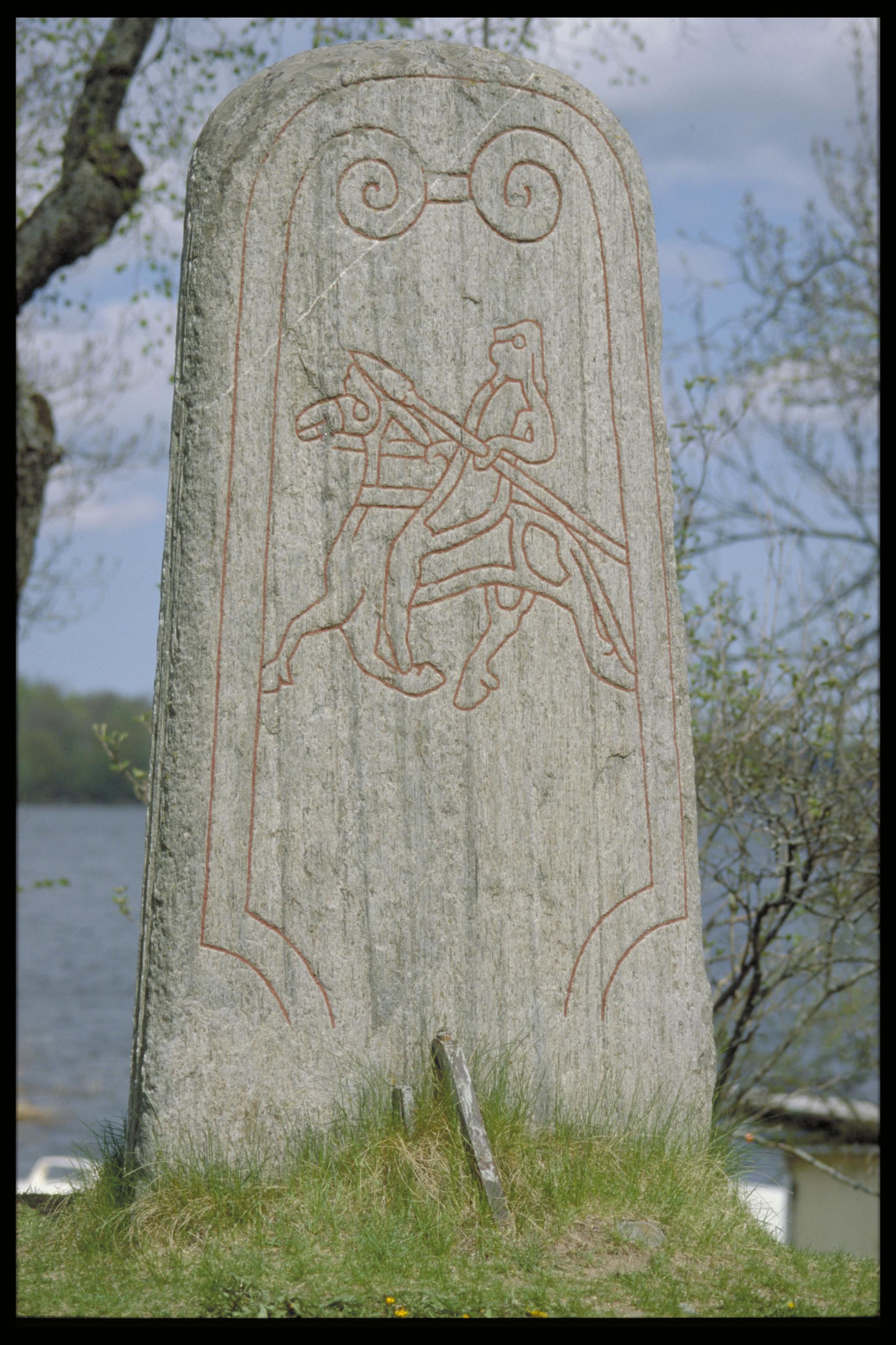 Till de senare skulle jag vilja räkna runristaren Vidbjörn, som jag fick möjlighet att bekanta mig lite närmare med för någon vecka sedan när vi skulle måla upp en av hans stenar. Stenen ifråga har beteckningen U 524 och står i en hästhage vid Penningby i Länna i Norrtälje kommun, mitt emot avtagsvägen mot Furusund. Vidbjörn är naturligtvis ingen ny bekantskap, men just denna sten har jag egentligen aldrig kunnat uppleva. Jag var visserligen där när jag skrev min avhandling om runristare 2007, men stenen var redan då täckt av ett tjockt lager med vit lav, som gjorde ristningen i stort sett omöjlig att urskilja. Helt annorlunda var mötet med stenen denna gång.