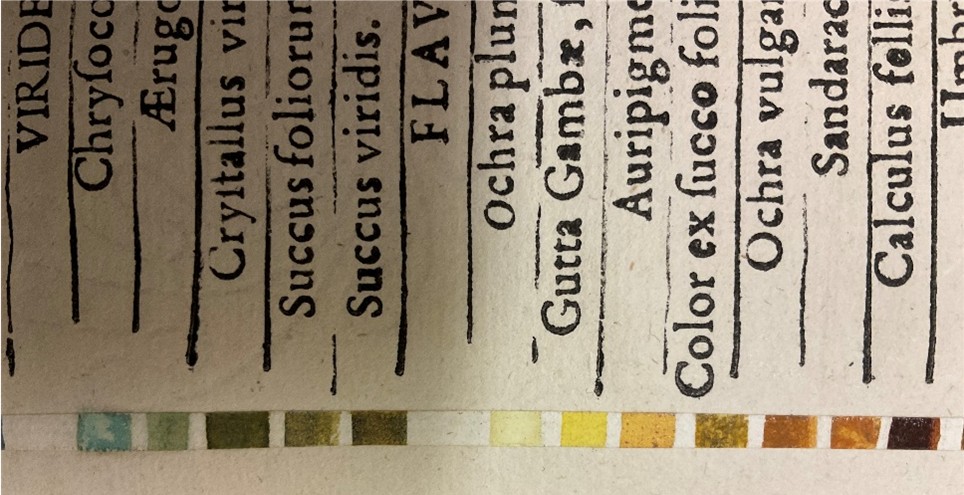 Pigment och färgämnen i Elias Brenners dokument Nomenclatura et Species Colorum Miniatae Picturae – thet är: förteckning och proff på MINIATUR färgår, Stockholm 1680 (två exemplar från Uppsala universitetsbibliotek). Foto Tom Sandström (CC BY)